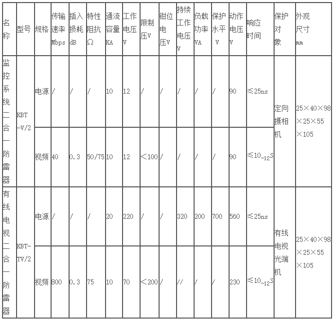 KBT-V2二合一監(jiān)控多功能防雷器采用BNC視頻接口,適用普通攝像機(jī)、固定攝像機(jī)、紅外機(jī)的防雷保護(hù)。電源工作電壓分24V(交、直流通用),信號工作電壓為6-12V。